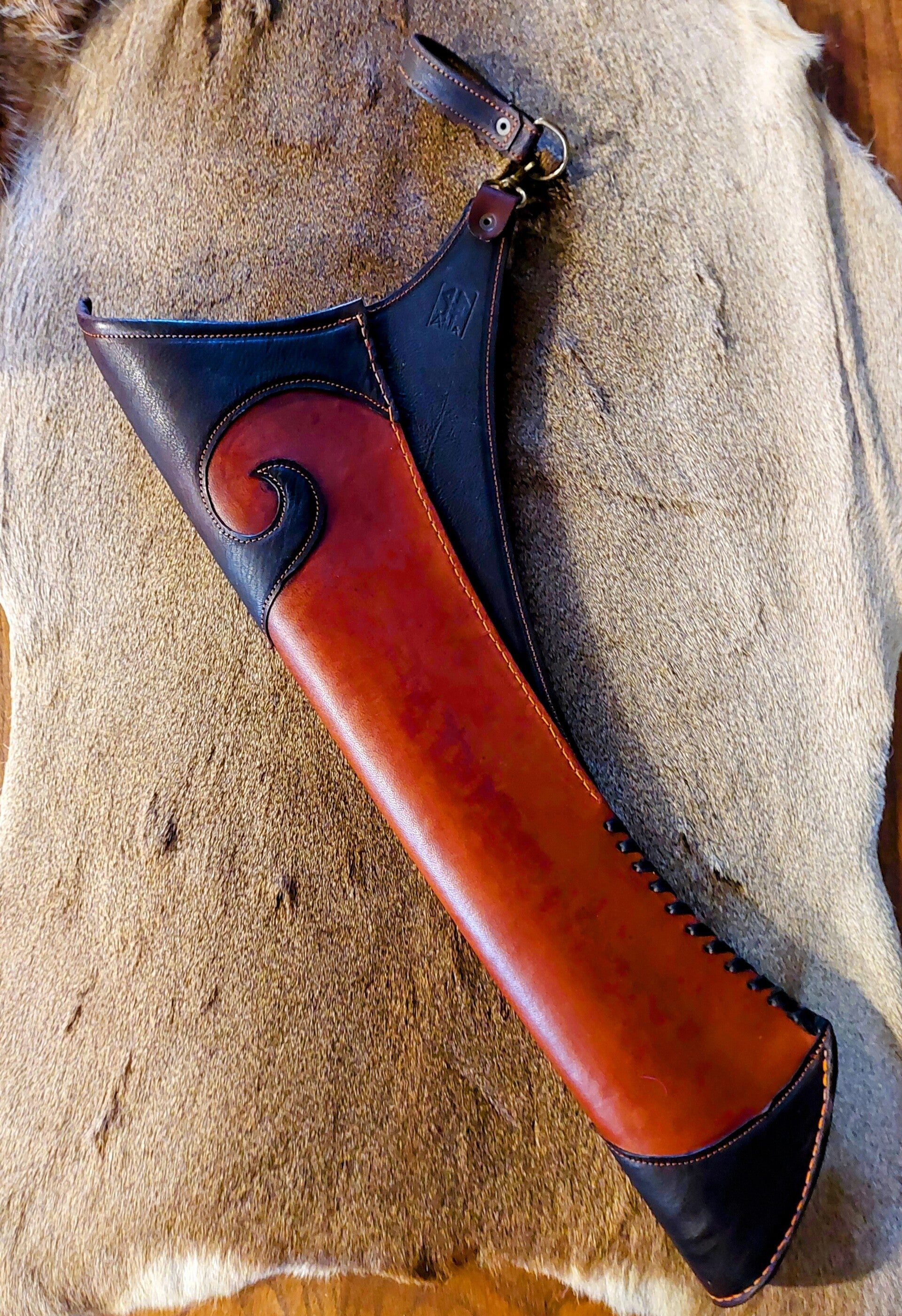 Prachtige zwaar leren pijlekoker voor zowel links als rechtshandige schutters. Voor ongeveer 12 pijlen.