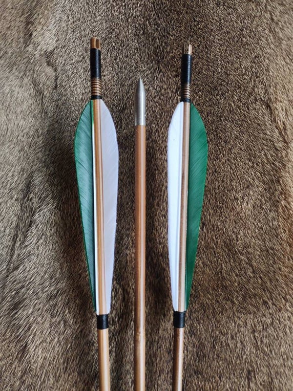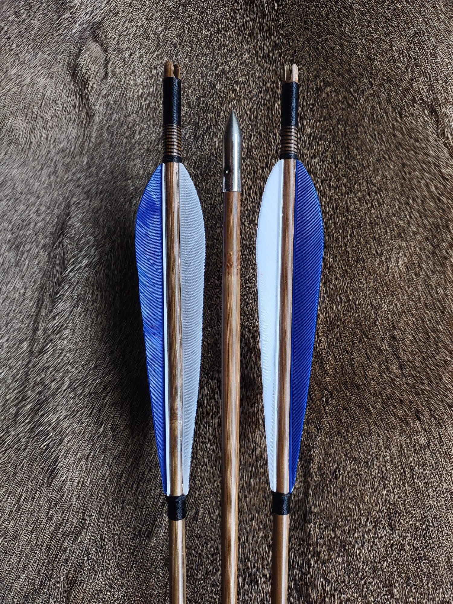 Set van 6 bamboe pijlen geschikt voor bogen met een pondage tussen de 45# en 50#. Deze pijlen hebben een ingezagen nock en gekleurde natuurveren.